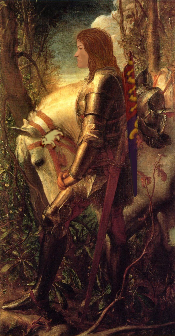 I recently posted a picture that I had fiddled with to put Richard’s head on a painting of Sir Galahad by George Frederic Watts. Just now, while looking for something else (doesn’t it always happen?) I came upon a stained glass window of the same painting. It’s the Cryder Memorial Window, before 1910. Leaded glass, 45 x 27 1/4 inches. St. Andrew’s Dune Church, Southampton, New York. Really beautiful. The pictures I have uploaded here are self-explanatory, I think. The first is the original painting (or rather, a version of it – I can’t find the exact one I used now), the middle one is my twiddle, and the one on the right is the stained glass picture.