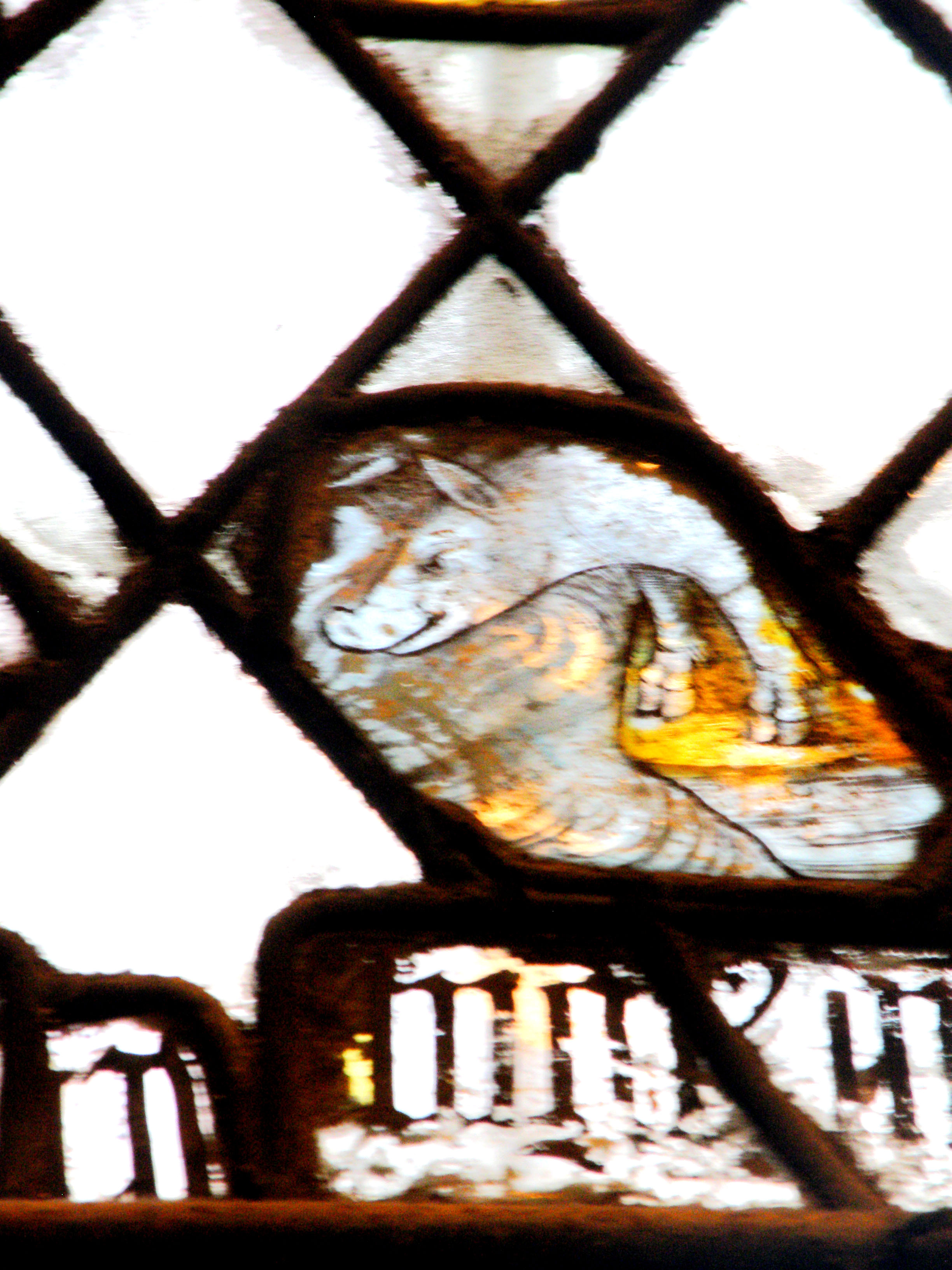Recently I was in Great Malvern and visited the priory church in the centre of town. It is known for its 15th century stained glass, including the West Window which was commissioned by Richard Duke of Gloucester and his wife Anne. Although the original Doom/Day of Judgement scene in Richard’s window is no longer visible, the glass having been scattered in fragments throughout the other windows of the priory, it is still possible, if one knows where to look, to pick out Richard’s white boar, his arms with two very damaged boar supports, and Anne’s arms with two bear supports.
