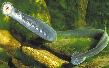 So what does this fish look like? Well, it is a long, eel-like fish with no scales or jaw and is a dark colour on its back (olive green to greyish brown) with a silvery underbelly. It has no bones, but only cartilage and no normal gills, just seven pairs of gill holes behind its ear. It has only one nostril on the top of its head. Instead of a regular fish mouth it has a round tooth-like opening with sucker-like lips and a rasp like tongue. Some species attach themselves to host fish and use their tongue to make a wound in the other fish and secretes an anti-coagulant so they can suck their blood, but they rarely kill the host fish, moving on to another host before this happens. Yes, it sounds lovely doesn’t it? Like a cross between an eel, a leech, a vampire and the Alien!