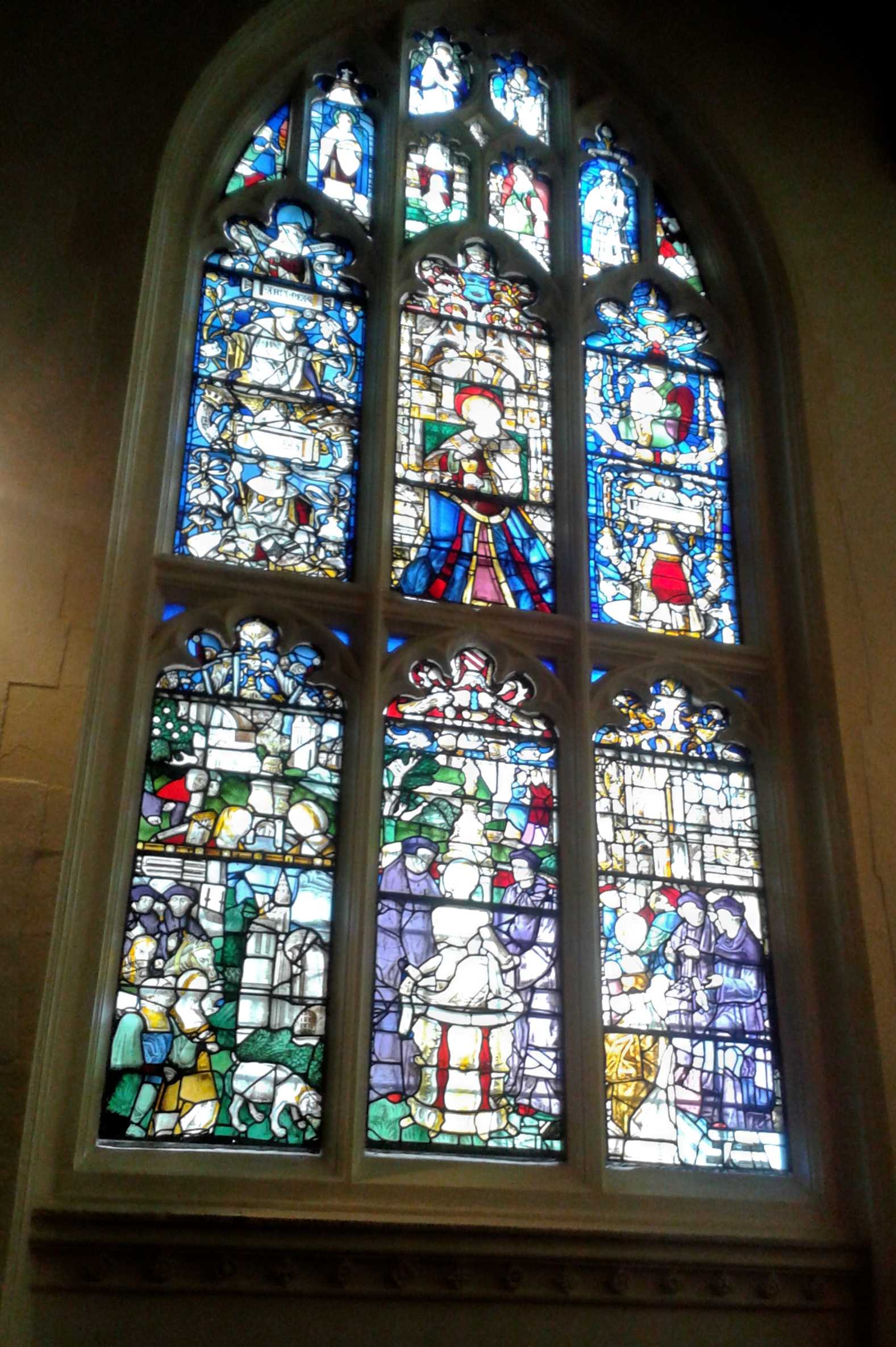 The stained glass windows were impressive as well as the font which is gigantic, and we found a tapestry depicting King Henry VI visiting the shrine of St Edmund in 1433.