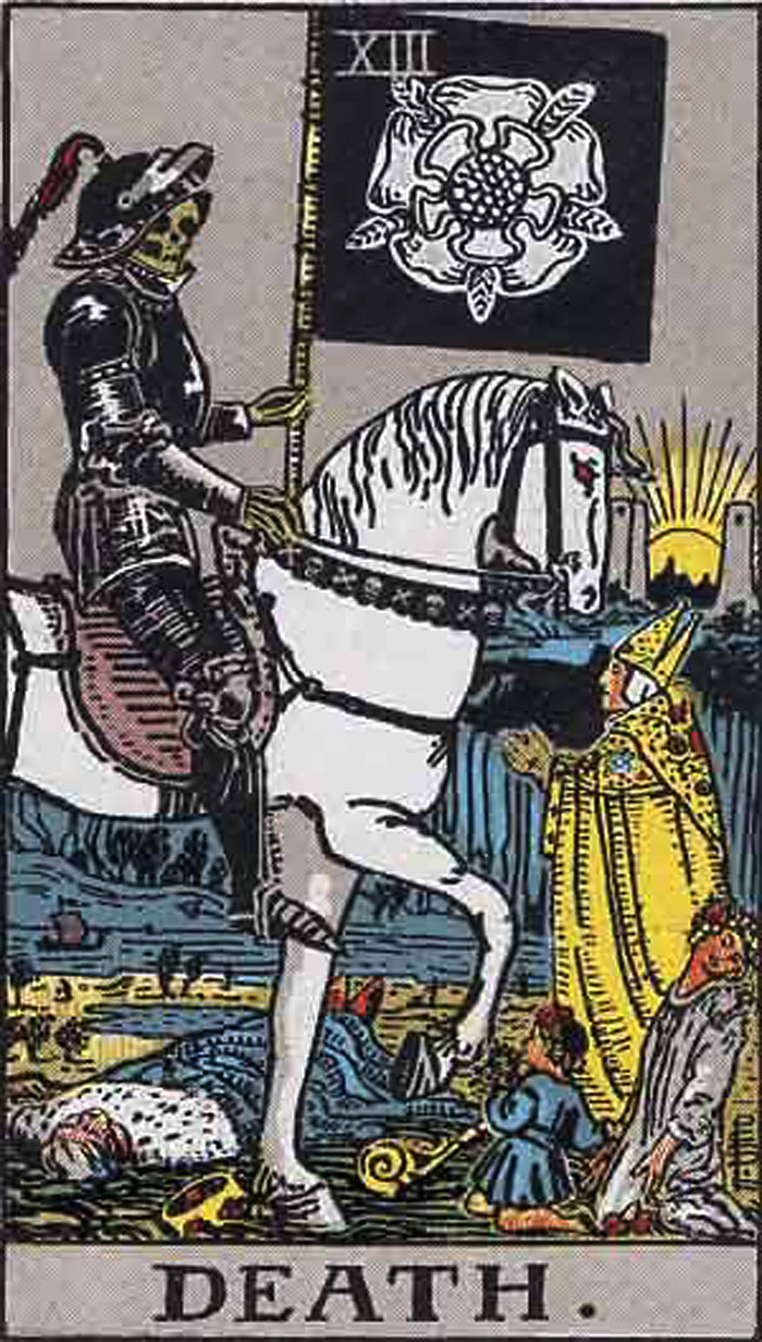 The veil or mask of life is perpetuated in change, transformation and passage from lower to higher, and this is more fitly represented in the rectified Tarot by one of the apocalyptic visions than by the crude notion of the reaping skeleton. Behind it lies the whole world of ascent in the spirit. The mysterious horseman moves slowly, bearing a black banner emblazoned with the Mystic Rose, which signifies life. Between two pillars on the verge of the horizon there shines the sun of immortality. The horseman carries no visible weapon, but king and child and maiden fall before him, while a prelate with clasped hands awaits his end.