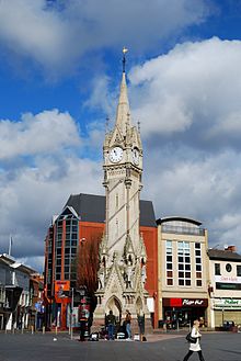 Those of you who attended part of Richard III’s reburial week, or visited St. Martin’s Cathedral and the Visitors’ Centre subsequently, may have wandered off into the east of the city centre along Cank Street, Silver Street by the old arcades, or even the High Street, past. At the end of High Street, into which the others flow, you may have turned back at the Clock Tower, where Gallowtree Gate, Humberstone Gate, Church Gate and Haymarket also meet, not necessarily having the time or inclination to explore another part of the city, with another shopping centre and a bus station. Humberstone Gate leads south to Granby Street and the railway station, passing the Town Hall Square with the four lions. You may even have checked your watch against the Clock Tower without examining its structure more closely.