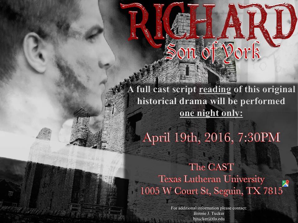 A full cast reading of “Richard, Son of York”, a new play, will be performed at Texas Lutheran University on Tuesday 19 April at 19:30 (and only that day):