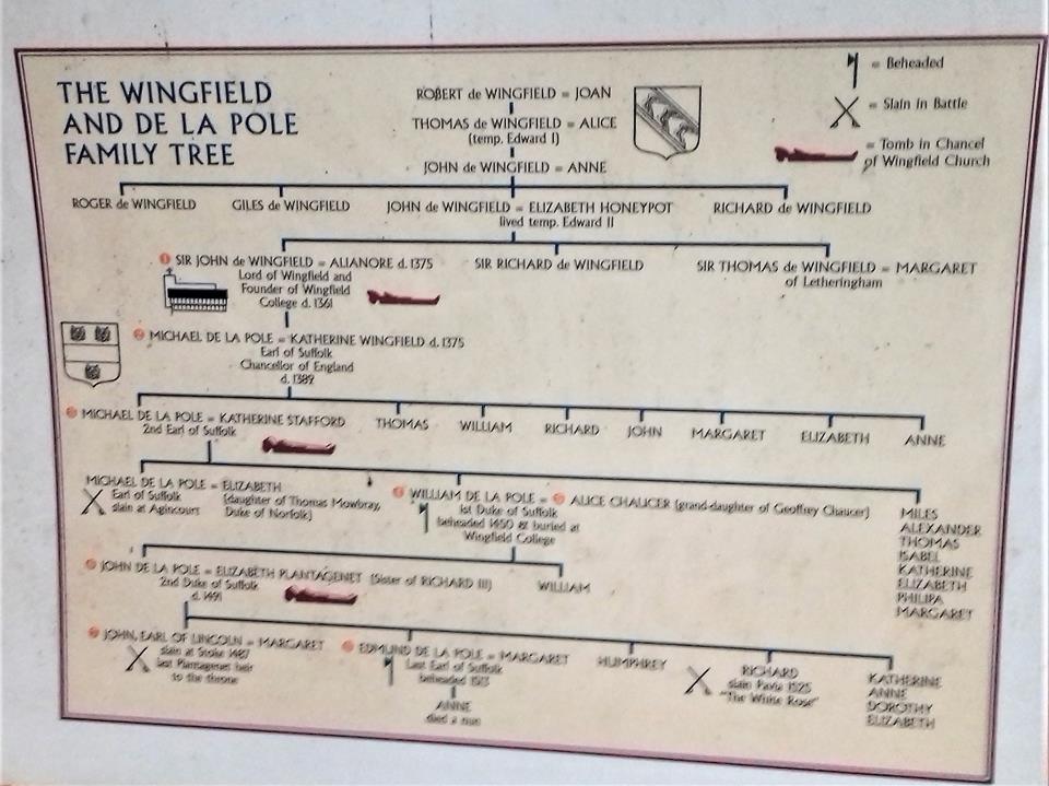 This Church tells the story of the de la Poles as they expanded from their mercantile origins in Hull and married an heiress of the Wingfield line. Monuments to three heads of the family and their spouses lie near the altar, which was moved further east as the church grew to accommodate the last of these tombs. Nearer to the door, a board (left) summarises the de la Pole genealogy as they experienced close association with the Black Prince, the wrath of Richard II, the vagaries of Henry V’s French expedition, sudden death aboard the Nicolas of the Tower, marriage to the sister of Edward IV and Richard III – and the reigns of the first two “Tudors”, the last confirmed family member dying in the Tower of London in 1538, although a mystery remains in France and in Italy. John de la Pole’s shield, replete with leopards, is among many in the church.