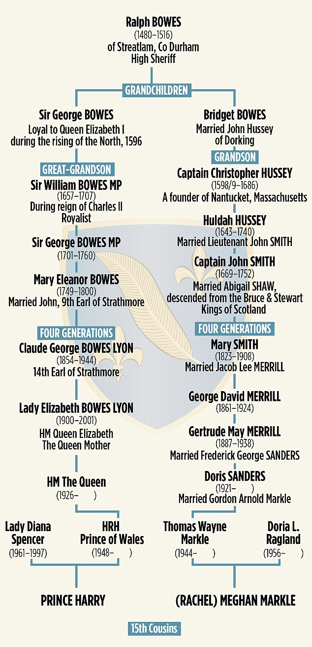Now it has been announced that Prince Henry of Wales and the American actress Rachel (Meghan) Markle, or Duke and Duchess of Sussex as they are to become, are to marry on May 19. Tracing her royal descent has been more difficult until this genealogical outline appeared in the Mail on Sunday, back to Sir Ralph Bowes (1480-1516/7). Bowes’ wife, Elizabeth Clifford, was descended from Edward III through the same Mortimer-Percy marriage as were the Cambridges.