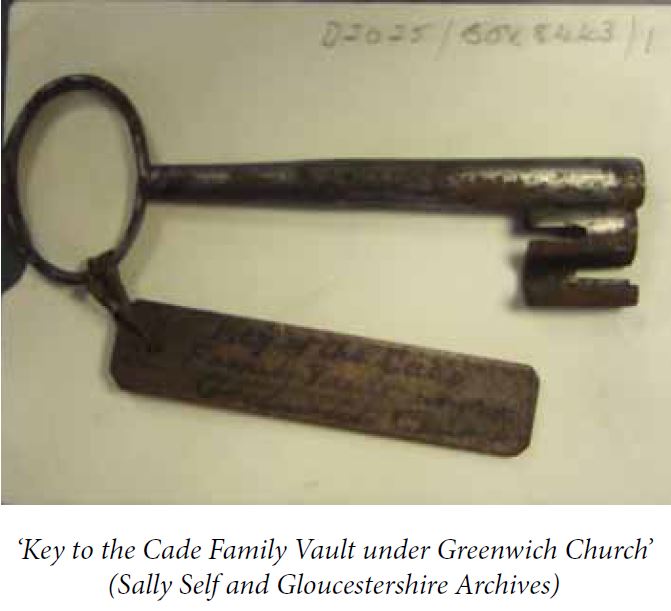 “When browsing for information on the ‘Cade’ family up sprung the words ‘Cade Key’. So, thought I, others have been there before me! Seemingly the family name was not ‘Cade’ but ‘Cade Key’ – I must have read the wooden tag incorrectly. Back to the key itself – but no it did indeed say ‘Key to the Cade Family Vault under Greenwich Church’.