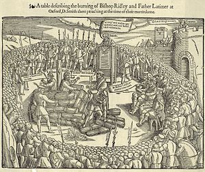 Here (left) we have the Martyrs’ Memorial near Balliol College, Oxford, that commemorates three of Mary I’s most prominent victims: Archbishop Cranmer and Bishops Latimer and Ridley. They were not the only episcopal victims but Hooper (Gloucester) and Ferrar (St. David’s) were executed elsewhere.