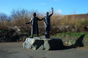 Statue depicting Cornish 1497 Rebellion leaders Michael Joseph “An Gof” and Thomas Flamank , sited at the entrance of the village of St Keverne, Cornwall, to commemorate the 500th Anniversary of the uprising .