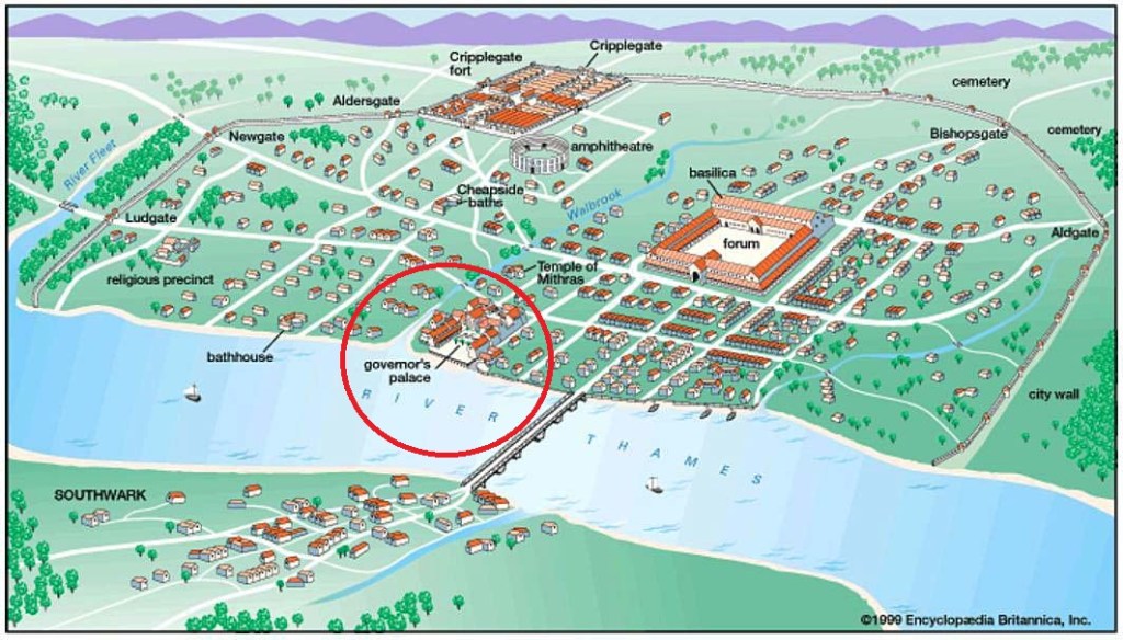 The stream has been covered over and built upon since the mid-15th century, but before then it was a very important feature, cutting the capital almost exactly in half from north to south. North being its source in the area outside the old city wall, now known as Finsbury; south being the shore of the Thames at Dowgate, where it is believed there was originally a delta. The Walbrook is thought to have split into two branches, and this lower portion of its course is called Dowgate, because it was a water gate in the Roman wall around the capital. At least, this is what I understand.