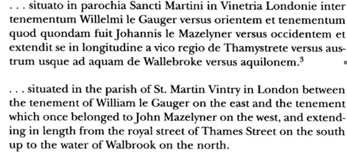 Thames Street is still a very long street, now divided into two portions, Upper and Lower, and so it is necessary to define this building’s whereabouts more accurately. The above deed, which was written in Latin, was printed in Life-Records of Chaucer, published by the Chaucer Society in 1900, and again in the Crow-Olsen Chaucer Life-Records, and describes the location of the tenement as follows:-