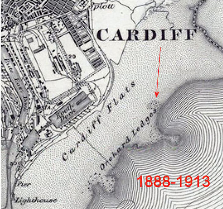 The above illustration has been inserted by me, and does not appear in the book. The resolution is not very good in the snip from the 1888-1913 Ordnance Survey map, but it shows that Portmanmor (various other spellings) Road acquired a kink at the southern end, and has these days been swallowed up by the docks and other developments. But the red dot-dash line follows the upper part of the road, and then reaches out into the estuary to the end of Cardiff Flats and the Orchard Ledges, where there is no visible sign of the stone port. It was from about this time that the port was omitted from all modern OS maps. And I don’t think that the above passage from The Holy Kingdom implies that Portmanmor Road extended right into the estuary, I have included the red line merely to show that the angle of the road would indeed reach out to the right point on Orchard Ledges.