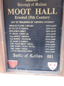 This Essex town, by the Blackwater Estuary and the narrower River Chelmer, lies about six miles from Witham and was previously accessible from there by train. This plaque (left) by the Moot Hall details the more recent historic buildings, many of them on the High Street. The Rose and Crown (bottom) is one of these, down the hill and still in operation as an inn today.
