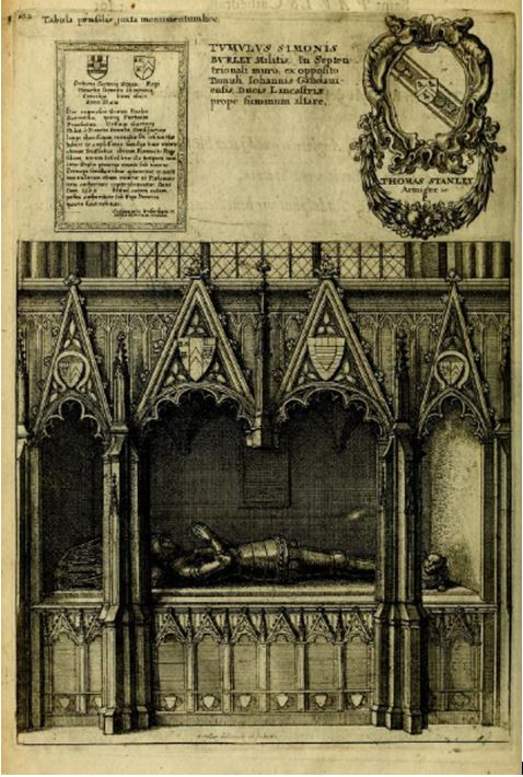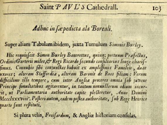 This I know from Dugdale (pp102-103) who gives illustrations of a tomb in old St Paul’s (destroyed in Great Fire) which was erroneously attributed to Simon but was actually that of Richard and Beatrice. She obtained a royal licence to build it, and financed it all, eventually joining her husband there. Another source is the Memorials of the Order of the Garter, Beltz, page 293, which gives details of the same “Simon Burley” tomb and explains that it was actually the resting place of Richard and Beatrice.