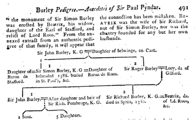 BUT, hang on there, if you look at the genealogical tree below, you will see that this is an error. Beatrice Stafford wasn’t married to Simon, but to his nephew, Sir Richard Burley. This is certain from other sources, as I will soon show