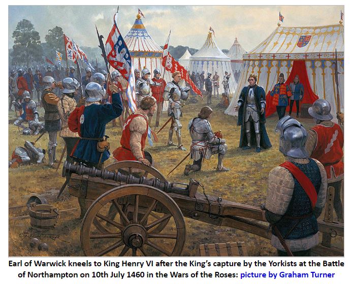 The last Kyriel of Westenhanger, Sir Thomas, was summarily executed after supporting the Yorkist cause at the second battle of St. Albans, which took place on 17th February 1461 and during which the great Earl of Warwick, known to posterity as the “Kingmaker” was slain. The Yorkists had earlier captured King Henry VI and during the battle they placed him in the care of Lord Bonville and Sir Thomas Kyriel. Once the battle was lost, Bonville and Kyriel escorted the king to the victorious queen, Margaret of Anjou, and the story goes that she asked her (apparently obnoxious) son—the boy Edward, Prince of Wales—how the two Yorkists should be treated and he replied that they should be executed. So they were beheaded, even though they’d behaved with honour throughout. And even though Henry VI himself wanted them spared. Kyriel left two daughters, the elder of whom married a Fogge, and thus the male line of the ancient de Crioll/Kyriel line of Westenhanger was no more.