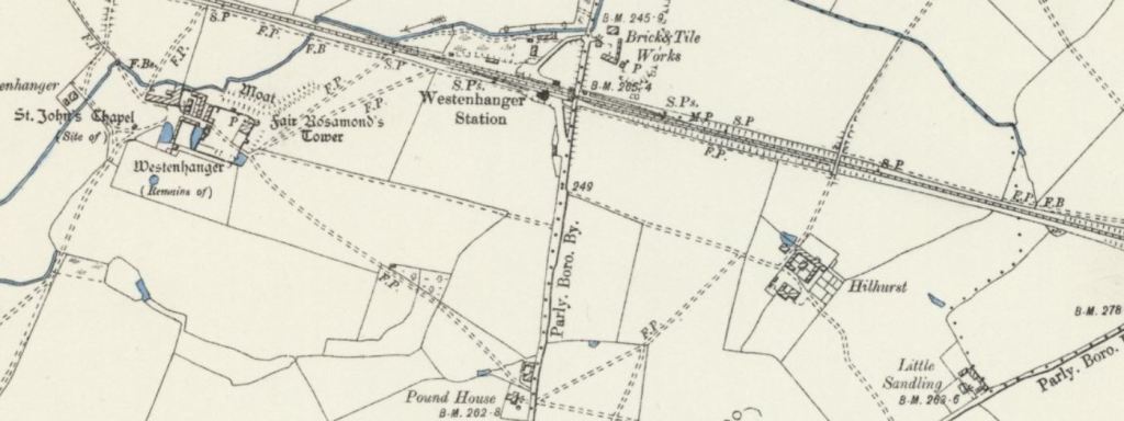 Below is another map of the area, this time an old OS map, showing Stone Street slicing vertically through the middle. There’s Westenhanger, top left, clearly drawn…so was Ostenhanger somewhere around where Hilhurst or Little Sandling are shown?
