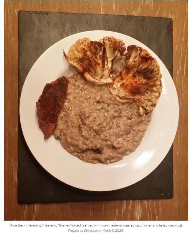 However, it has to be said that the dishes mentioned (and illustrated, see above and below) were rather…ugh! when actually on the plate. Not the fault of the cook. Oh, no. It was just impossible to make these things look even vaguely appetising. Not even for a monarch as picky as King Richard II, from whose book of recipes—Forme of Cury—they have been taken. I mean, the gruel in the illustration looks like, well, a pile of sick. The mounchelet below looks even worse. All both lack are the proverbial bits of carrot, which we always seem to find in such deposits.