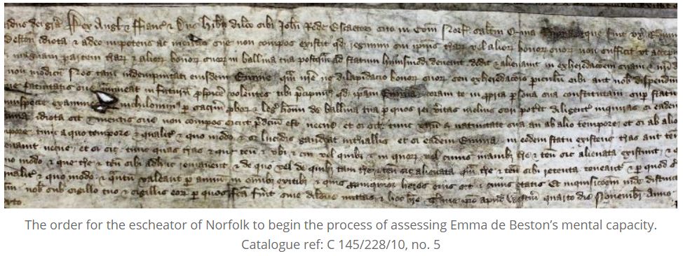 “….the examiners concluded that Emma was of unsound mind – in contemporary language, ‘having neither sense or memory nor intelligence to manage herself or her goods, with the face and countenance of an idiot’. As a result, her personal custody was confirmed with her then guardian, but her lands were assigned to four burgesses from King’s Lynn. The profits of her estates paid for her care, clothes and maintenance. Emma died in that state on 30 December 1386 and left her estate to her niece, Isabel….