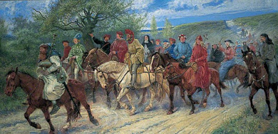 In the text Chaucer has his pilgrims point out places they’re passing, so it would seem the stories were being told as they rode along. But someone at the back of the cavalcade couldn’t possibly hear someone at the front. Could they? I can only conclude that the tale-telling went on when they halted at the wayside, or stayed somewhere overnight.