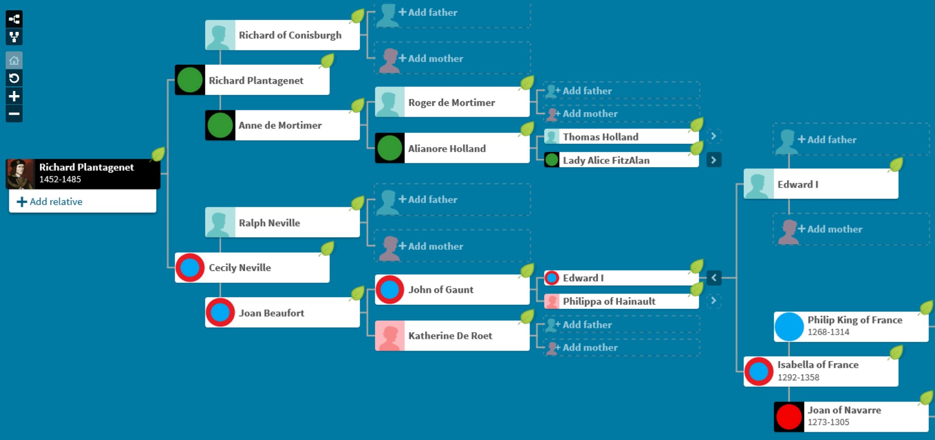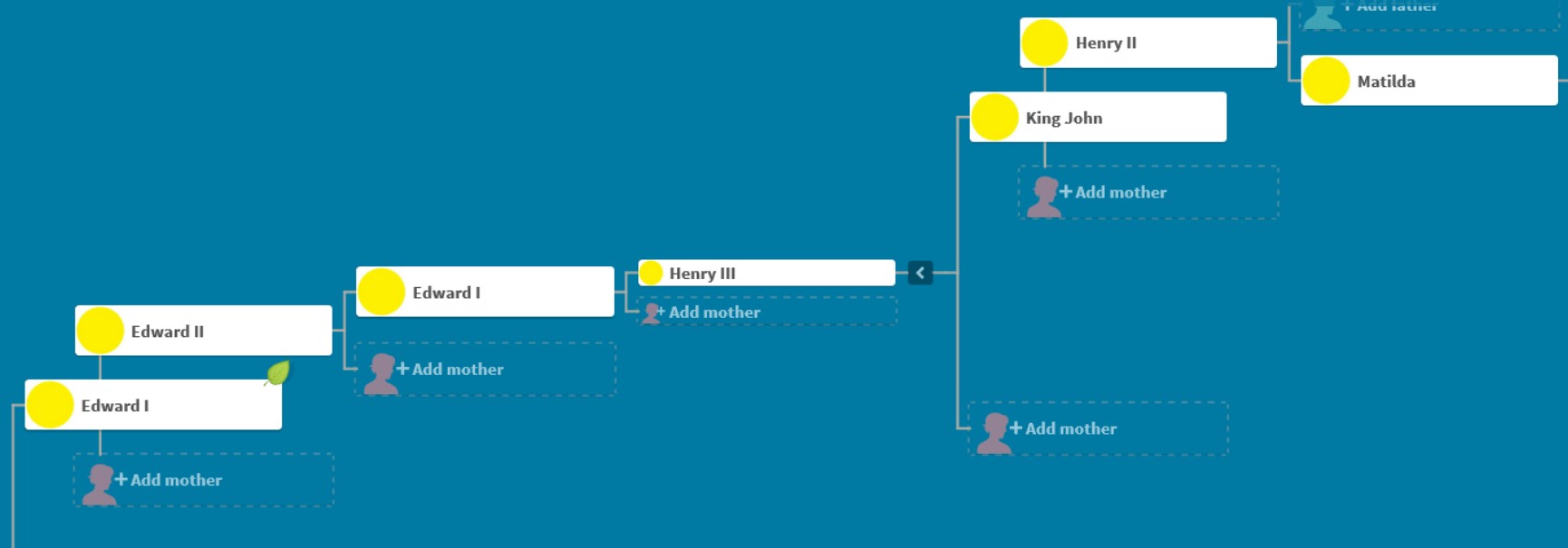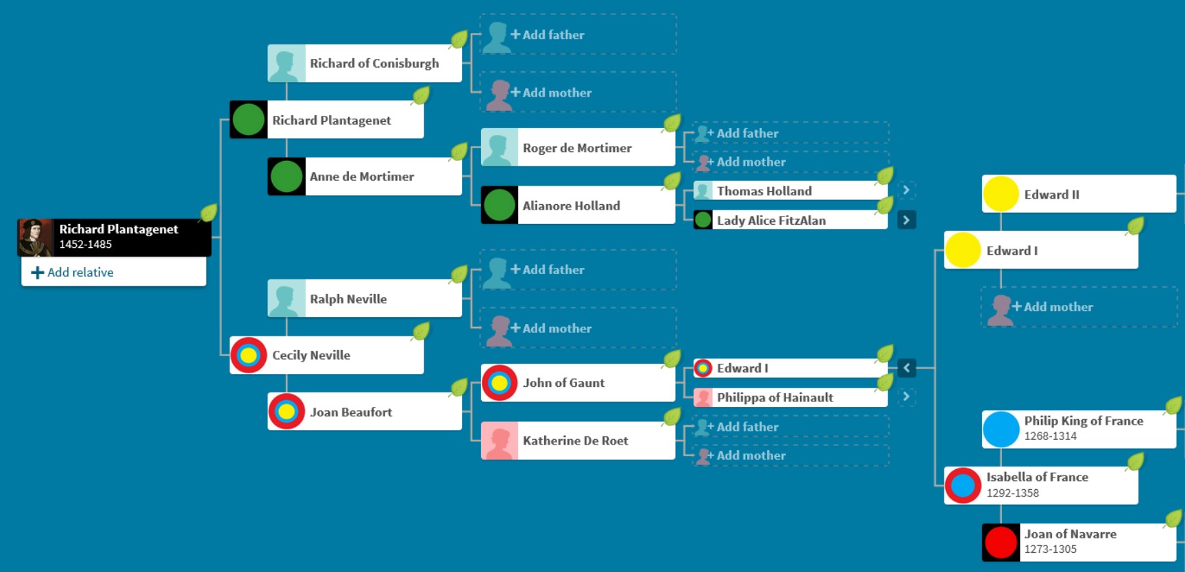 We all know that Richard is directly descended from William the Conqueror, who is his eleven times great grandfather. Here is Richard’s pedigree to William in three parts – follow the yellow dots left to right. (N.B. the first few generations have the yellow combined with red and blue which lead to other ancestors).