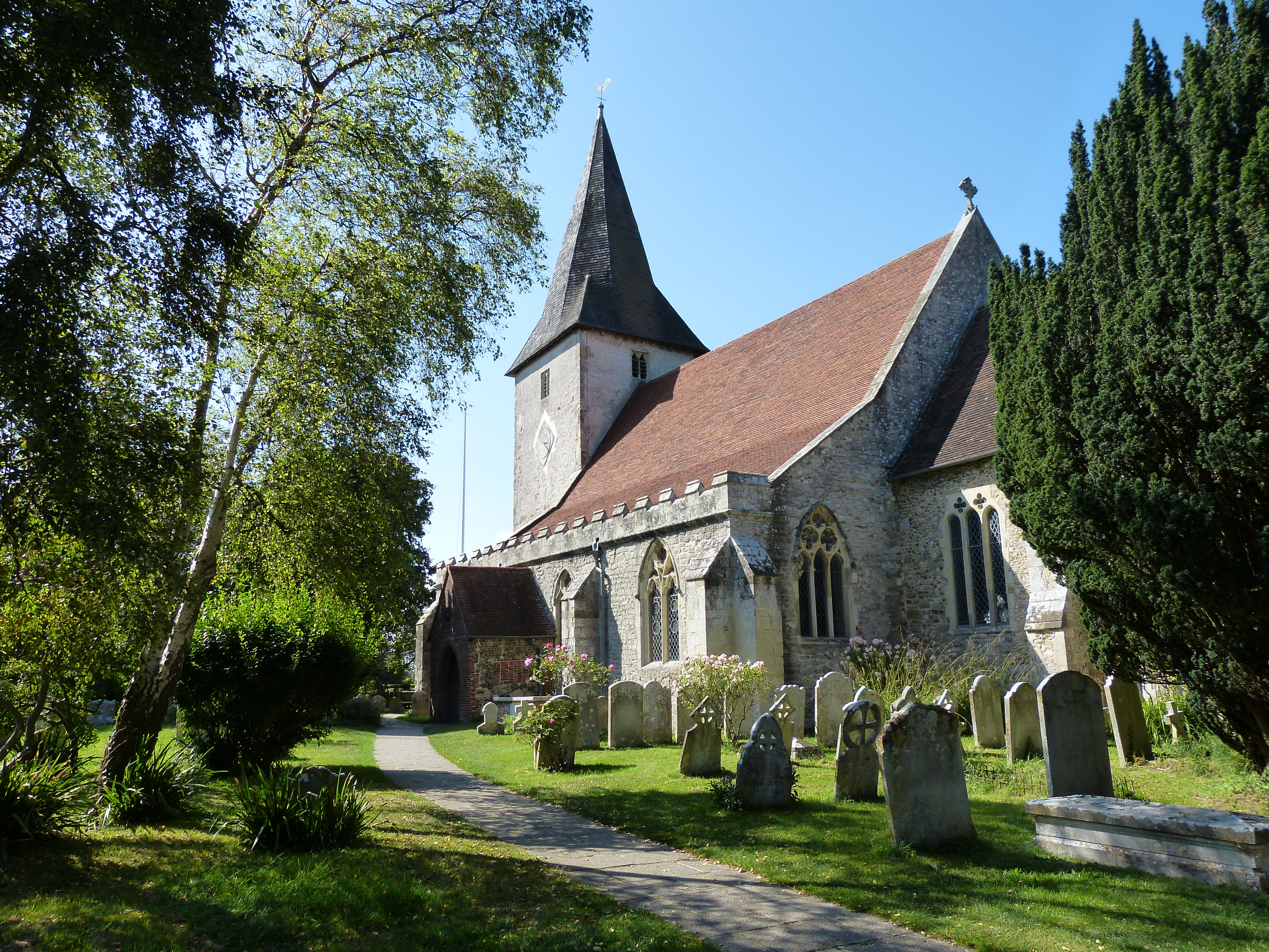 Left: Harold’s supposed burial at Waltham (Harold_Stone_Irid Escent, CC BY-SA 2.0 via Wikimedia Commons) and right: Church at Bosham (Bosham.Holy_Trinity_Church.-_panoramio grumpylumixuser, CC BY 3.0 via Wikimedia Commons)