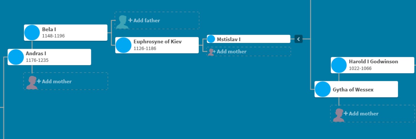 1. It’s just that on the screenshot the regnal numbers didn’t display correctly. The Gytha on the pedigree is Harold’s daughter and Mstislav is her son – it’s just her husband who isn’t on there – I left him off for simplicity but it seems to have backfired!