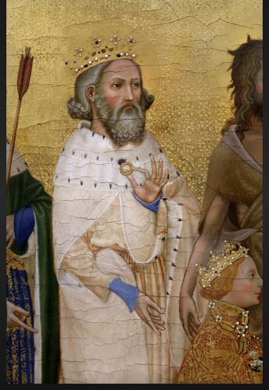 Edward the Confessor as depicted on the wilton Diptych, with Richard II kneeling in the foreground. Richard was the saint’s great admirer.