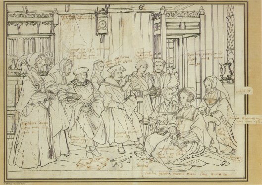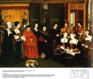 Sir Thomas More was one of the most influential men in Henry VIII’s England in the 1520’s. A close friend to the king, this lawyer’s star was on the ascendant when artist Hans Holbein arrived in England. Probably in 1527, Holbein was commissioned to execute a group family portrait for Sir Thomas. He made a sketch, which he probably took back to the Continent with him to translate into the final painting. The painting includes Sir Thomas, his son, his daughters, including his adopted daughter, his second wife and his late father. There are also a few other figures who may not attract the eye, but it is upon one of these figures that Jack Leslau built his fascinating theory.