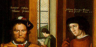 I would add as my own observation that the figure of Henry Patterson, More’s fool, bears a striking resemblance to Henry VIII. He also appears to sport a red and white rose, separated, on the top of his hat. Henry also stands just below John in terms of height in the portrait. If the height is used to mark precedence, then the order would appear to be: A missing royal who has just died (Edward V), John (Richard, Duke of York), Henry (Henry VIII). This appears startlingly blatant to me, dangerous for both Holbein and More, particularly if Henry VIII knew who John Clement was, yet perhaps Henry was in on the joke?