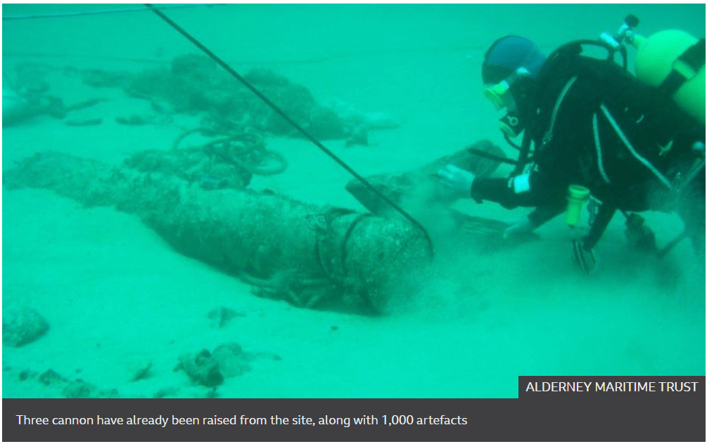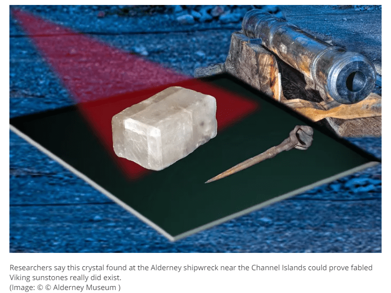 Anyway, it was believed for a long time that the sunstone was mythical, and invention for the magical Norse sagas, until an amazing discovery was made in 2011, when one of these sunstones was discovered and its use realised. Where was it found? Off Alderney in the Channel Islands. How? Because divers were exploring an Elizabethan warship and found an unusual crystal with dividers and other navigation instruments.
