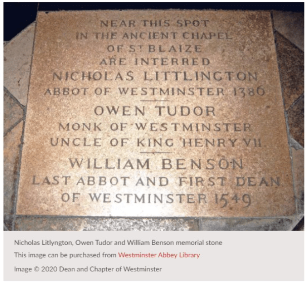 Coming upon the above photograph of the memorial of “Owen Tudor, monk of Westminster, uncle of Henry VII”, was something of a surprise to me because I thought Jasper was Henry’s sole paternal uncle. There is no date for him on the memorial, but I imagine this Owen died before Henry even knew him. After all, before usurping the throne, Henry had spent a large part of his life in exile.