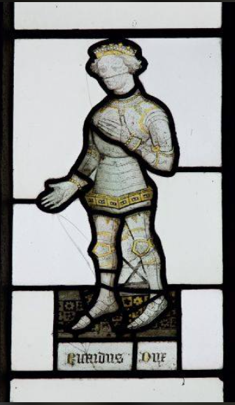 There aren’t many likenesses of the duke from his actual period. Two are in stained glass. The first is from a window at Trinity College, Cambridge. The second from the church in Cirencester