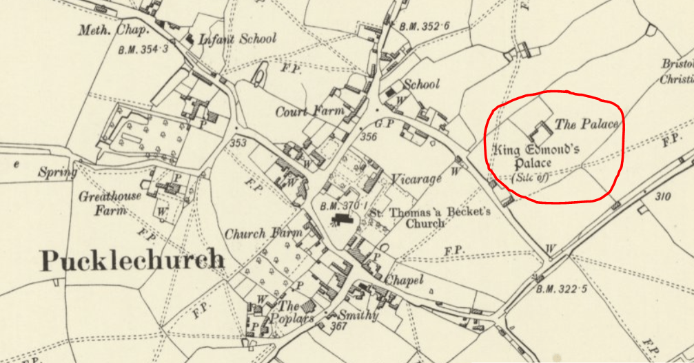 More famously, Pucklechurch was also the scene of a royal death, when King Edmund of the West Saxons died in his hunting lodge, which was behind the (former) Star Inn. The site is still marked on OS maps. The map below is an old OS sheet.