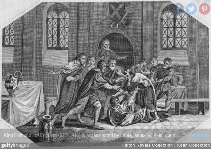 [Edmund and] “….his entourage were celebrating the Feast of St Augustine of Canterbury on 26th May 946 when he noticed Liolf (or Liafa) whom he had outlawed some six years earlier. Edmund ordered his cup-bearer to put the man out. A struggle developed. The king joined in. Leolf fatally wounded him with a ‘master dagger’, and fled. The rest of the company was too drunk to intervene. Edmund was buried at Glastonbury Abbey….”