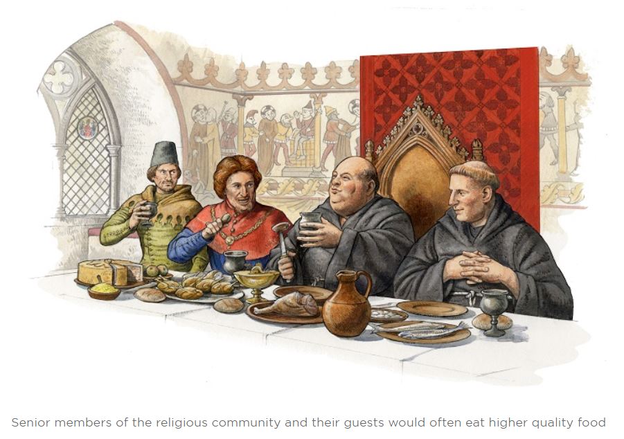 “….The monks ate lots of fish (herrings, oysters, flatfish, sturgeon, whelks, cod etc.) and had beef, mutton, pork and some chicken and duck, with bread, beer, cheese and eggs but very few vegetables….”