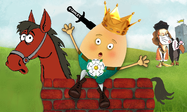 Perhaps it’s wrong to treat this theory as new, because it turns up again in here The wall upon which Humpty-Dumpty sat was….his horse. Humpty himself was Richard III, and his horse was called The Wall. Got it? You have to admit it’s different. Apart from the fact that I can’t imagine that even a 15th century horse would be given such a name, I certainly can’t see why Richard himself would be called Humpty-Dumpty. He was a slender man, not very tall, and Humpty was a very large egg. Oh, but apparently a Humpty-Dumpty was 18th-century slang for a short, clumsy person. Clumsy? Richard? I don’t think so.