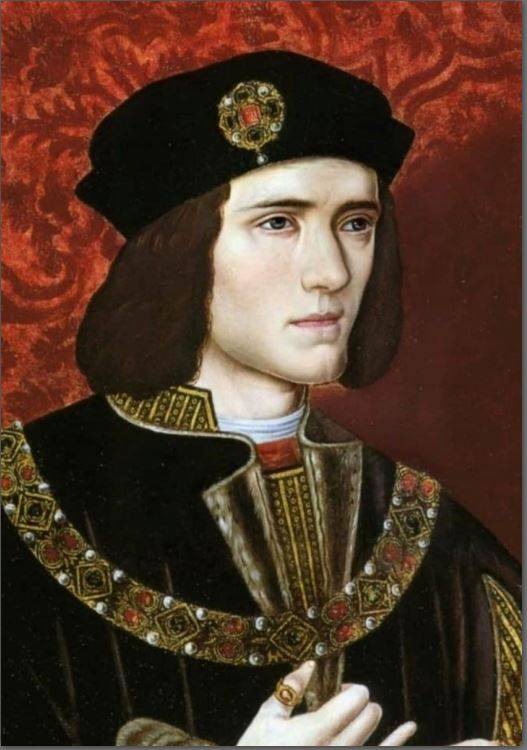 Where Richard III is concerned, his physical appearance is all important. His enemies alter his portraits to give him an evil, scheming aspect that suits their agenda. His friends prefer more flattering portraits that show him as he really was. There is one portrait in the National Portrait Gallery (above) that is perhaps the most famous one of him…and the Tudors set to work with subtle brushwork to change him. Sometimes he’s made to look quite yellow and ghastly. Anyway, the above portrait, in which he perhaps looks a little sad, to this below….