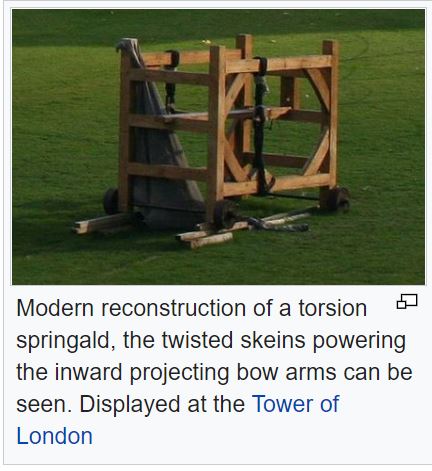 According to Wikipedia, a springald was a cratelike construction, not at all like the “dwarvish wind lance”. A Google Images search for springald produces all manner of weapons, from ordinary crossbows to cannon, from catapults to ballistas (which Merriam-Webster tells me is an ancient military engine often in the form of a crossbow for hurling large missiles). This, I confess, looks more like the dwarvish wind lance.