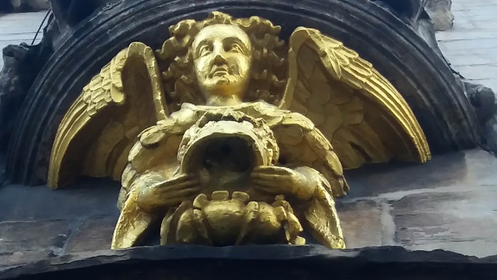 The rest of the town has a few other places of interest close by. Another medieval inn, The Blue Pig, the ancient school attended by Isaac Newton, and the very imposing church which has a collection of medieval books, a rebuilt shrine to St Wulfram, a Saxon Saint, a fine 15th C carved font and a couple of ruinous medieval tombs with interesting carvings including an elaborate knight’s helmet..