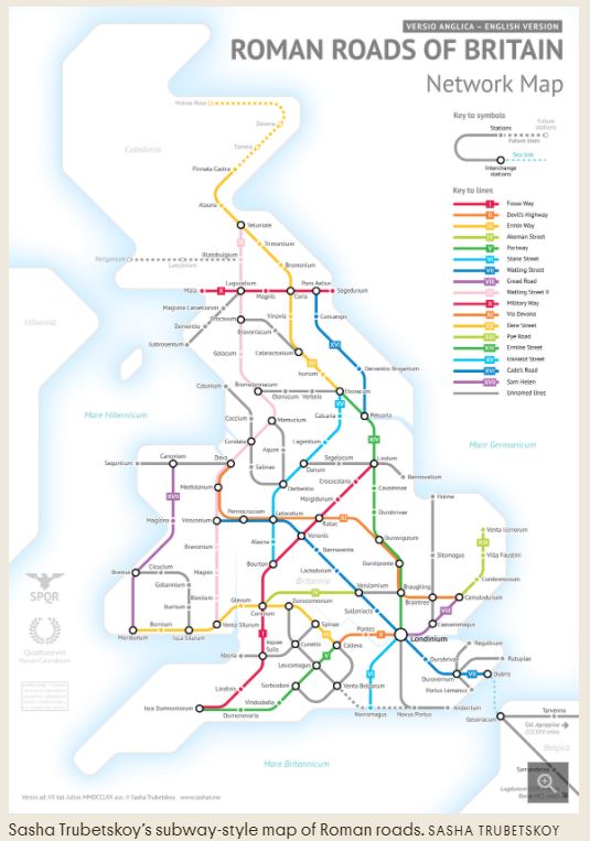 Finding the Roman roads of England and Wales can be tricky, but now there’s a “London Underground” map that identifies them all. Well, not quite, but mostly. On discovering this site I went immediately to find Stone Street in Kent…but it’s marked as unnamed.