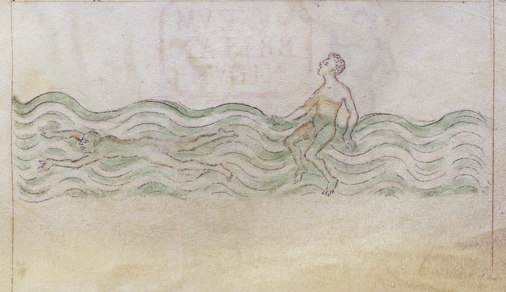 Just how many people could swim in medieval times? I imagine that the scene in the above illustration is somewhat fanciful. A king in full armour could swim and keep the crown on his head? At least, I think he’s swimming. If he’s drowning he doesn’t look particularly distressed, in fact he’s smiling! (And just what is that looming green-black shape on the right? A monster? Or just some weirdly shaped land?) So, he’s swimming, completely clad in metal with his crown balanced precariously on his head. It seems like a new, particularly fiendish Olympic event. Whether it’s possible I don’t know, but somehow it seems likely to remain in the realms of the imagination. Being fully clothed or just plain naked seems more likely when one went for a medieval dip.