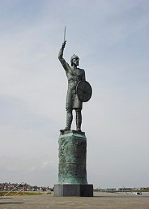 The first thing to notice about this is that is an embroidery not a tapestry, although the “Bayeux Tapestry” is also an embroidery ie hand-stitched. It was constructed to mark the millennium of the 991 Battle of Maldon, at which Vikings, possibly under Olaf Tryggvason, defeated and killed the Saxon Earldorman Brythnoth. It is displayed behind glass in the Maeldune Heritage Centre, the ground floor of the redundant St. Peter’s Church and below the Thomas Plume Library, on a corner of the High Street that leads downhill and to the east.