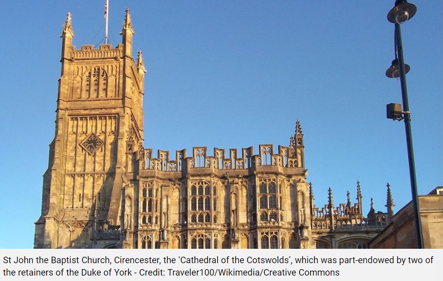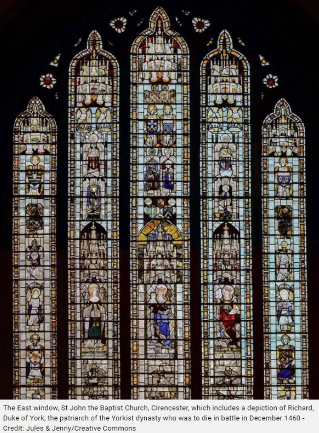 A good question. There wasn’t a specific War of the Cotswolds, but there was (still is) a connection to the Wars of the Roses, as you’ll see in this article . For instance, there’s the wonderful Church of St John the Baptist at Cirencester (see above) which was apparently endowed by retainers of the Duke of York. The duke features in its east window….as does one of the Mortimer Earls of March. He’s to be seen top left, holding his arms. The Mortimers were, of course, descended from Lionel of Clarence, a more senior son of Edward III than John of Gaunt, from whom the Lancastrian side claimed descent.