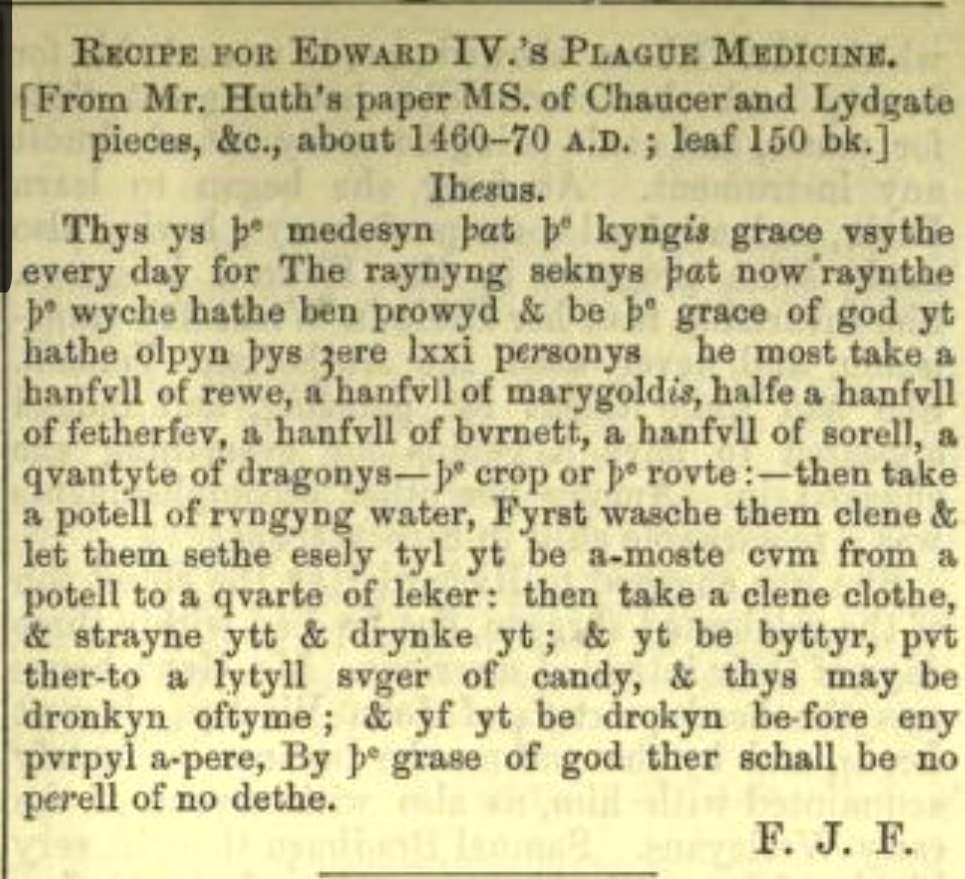 In this time of our own ‘plague’, it is interesting to see that Edward IV had his own concoction for an unpleasant disease recorded as ‘the rayning sickness’ (raining, reigning?–not sure what this word translates as– maybe the King’s Evil (scrofula?))