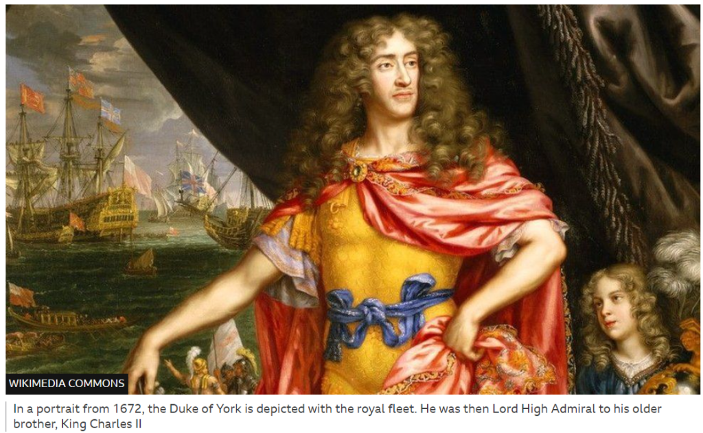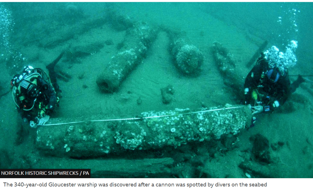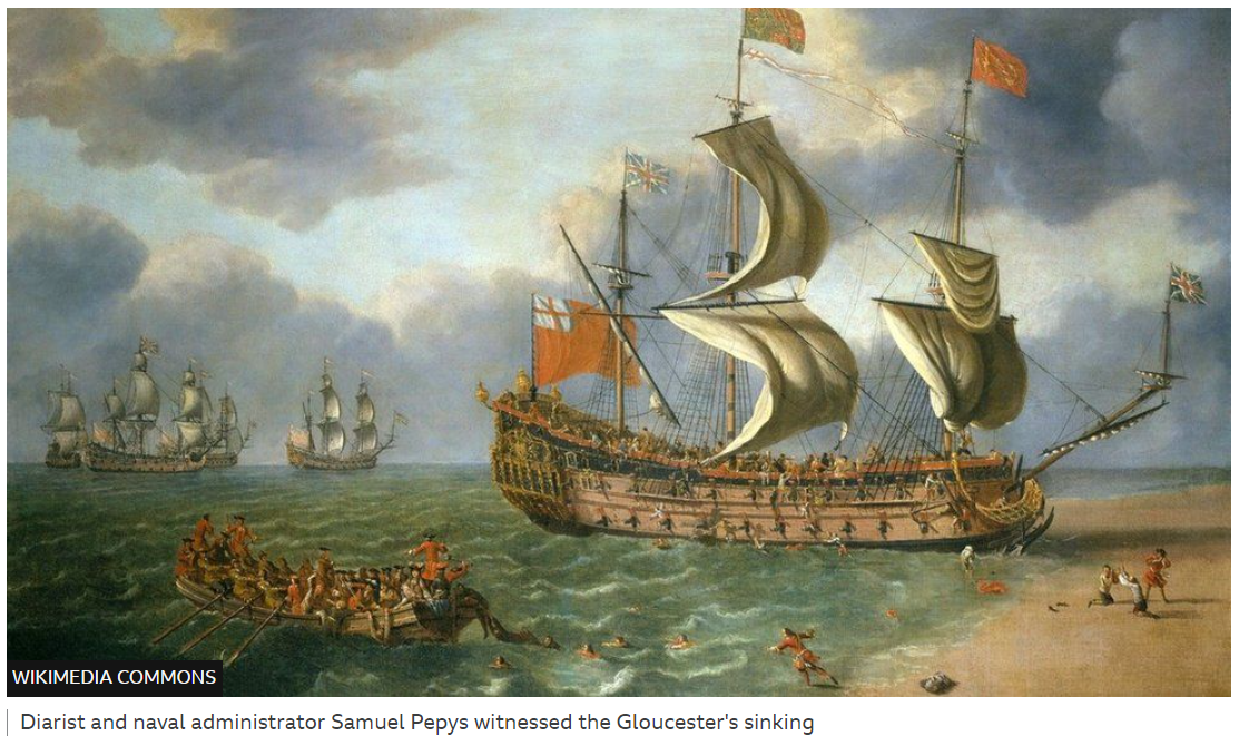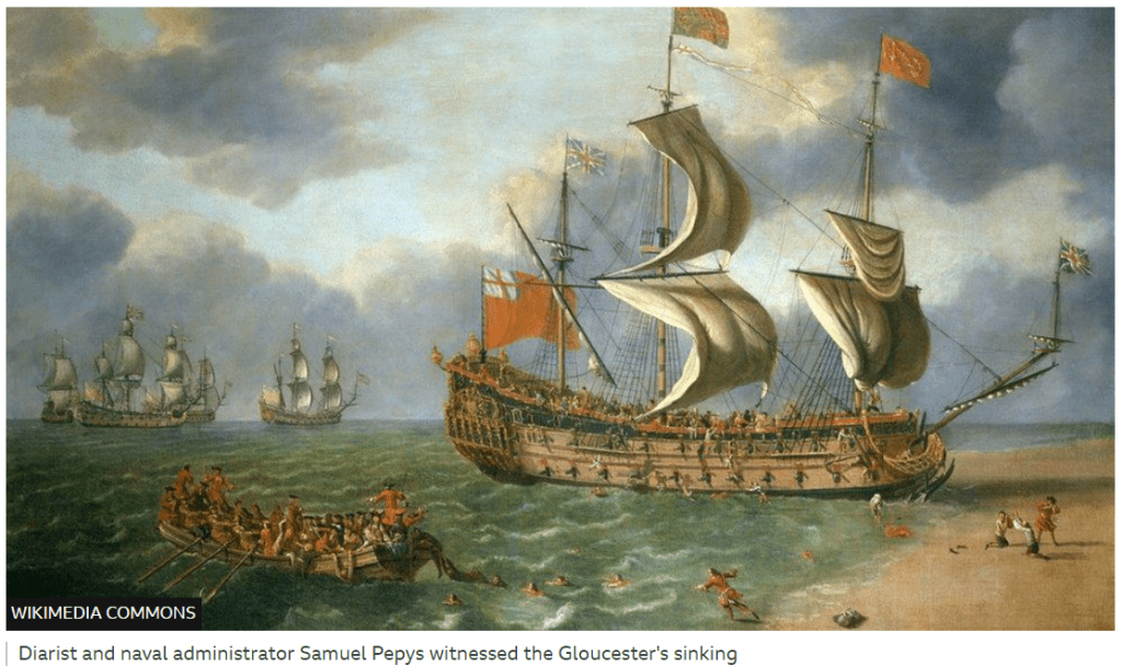 Now we have another royal ship found beneath the waves—further out at sea than the Mary Rose and actually found in 2007 but kept quiet—the Gloucester, which was bringing to England the brother of Charles II, James, Duke of York (later James II). Hundreds of people died when the Gloucester went down, but James escaped, as you can read here.