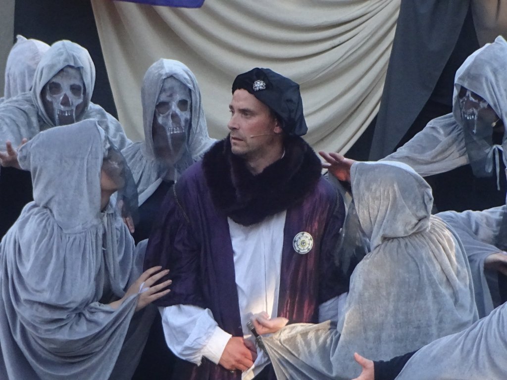 The action starts on the night before Bosworth, with a bevy of ‘ghosts’ appearing to a troubled Richard as they do in Shakespeare’s play. Clad in grey misty robes with skull faces, they were truly pretty terrifying, and they carried a pair of puppets of the “Princes“, which they flipped around to reveal two skeletons!