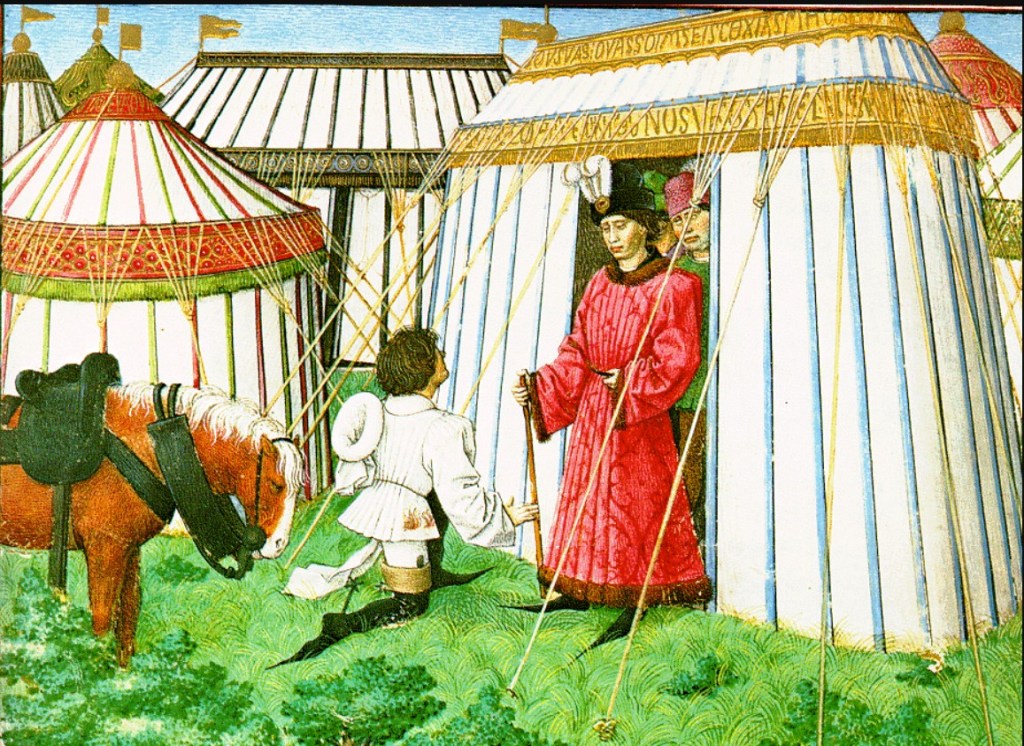 In April 1382, at peace negotiations between England and France, the participants were entertained by the Count of Flanders, who erected “the great tent of Bruges” in which to wine and dine the gathering. This was between Calais and Boulogne. I’m curious about this great tent. Just how big was it? We’re accustomed to seeing smallish pavilions in medieval illustrations, but this must surely have been more like a huge marquee. Froissart appears to be the only source for this great tent. You can read about medieval tents and pavillions here.