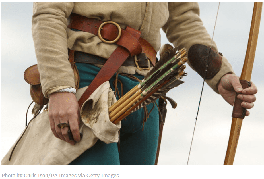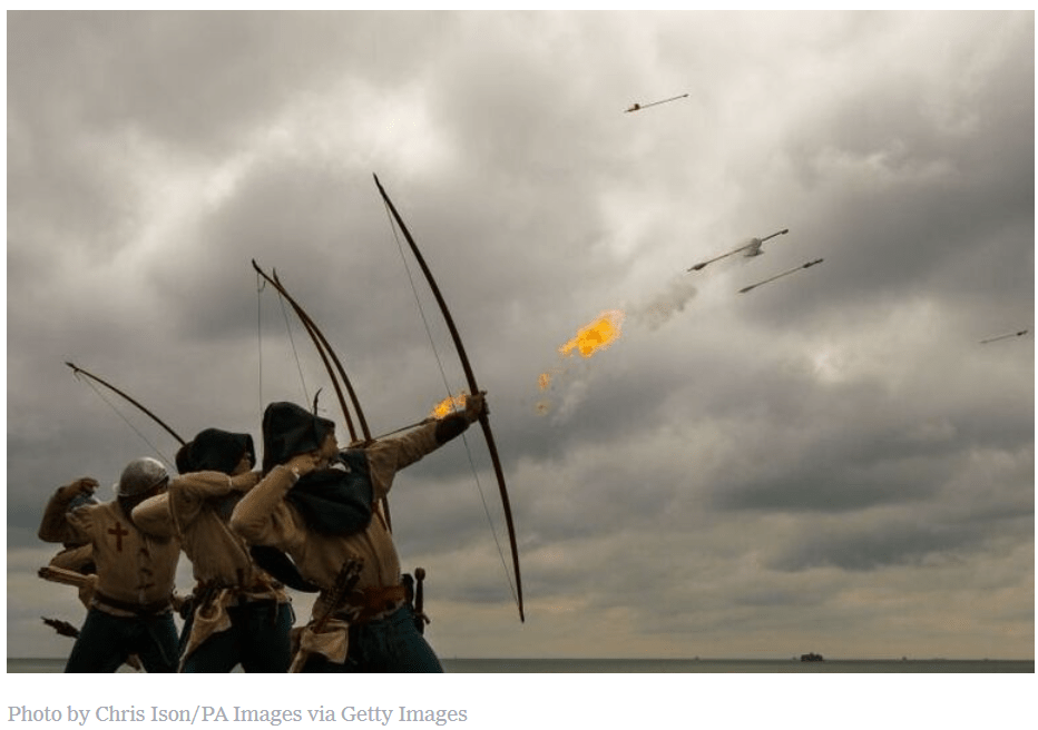To begin with it seems you’d never see swords on a battlefield. You’d more likely see bl–dy great battle axes, “maces, morning stars, war hammers, and other bludgeoning weapons”! Good grief. And they didn’t waste precious arrows on the dramatic “rains” of arrows we see so often, flying high and then coming down to wreak havoc on the enemy. Well, you’d see them, but used very judiciously indeed—certainly not over and over. The arrows would have been depleted in double quick time.