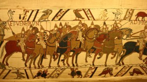 This enthralling BBC Four documentary describes the story of the artwork that is actually a seventy metre embroidery on a woollen surface. It was mostly filmed at the Bayeux Museum, where the artwork is displayed in temperature and humidity controlled conditions. The presenters pointed out that the “Tapestry”, obviously dedicated to Odo Bishop of Bayeux, as some of the images depict him in a Christ-like context, stops very soon after the battle without going on to William the B … er … Conqueror‘s coronation, implying that there is a missing end part to the 1066 narrative.