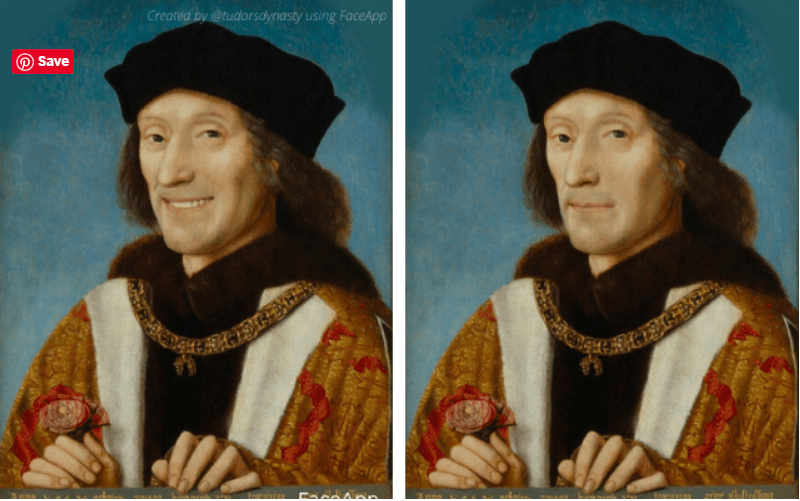But glamourised or not, even with a smile, Henry VII isn’t handsome (see above left). His large nose rather gets in the way and we know that one of his eyes was disconcertingly slow to move with the other. Even with modern prettifying he looks as if he knows something we don’t…and when we do we’re not going to like it one little bit! His face has “You suckers!” daubed all over it!